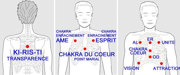 - Ponto KI-RIS-TI das costas: entre as omoplatas, a meia altura (sob a 5ª vértebra dorsal). Raiz do chacra do Coração.